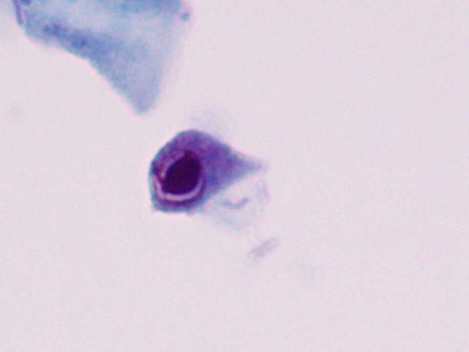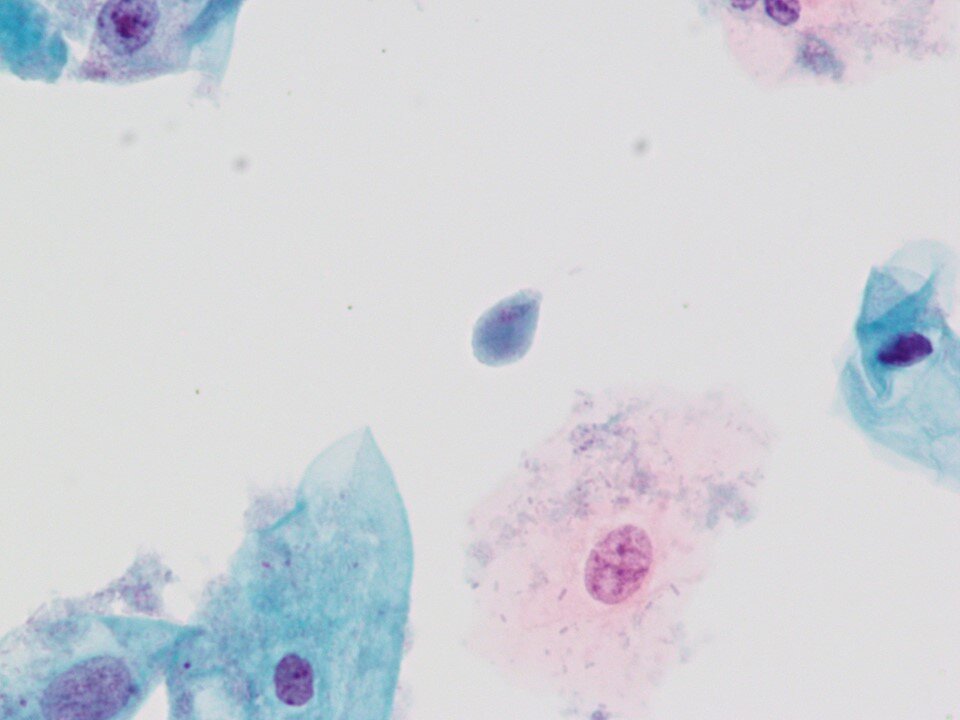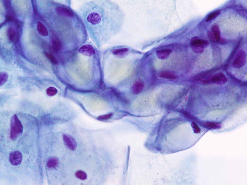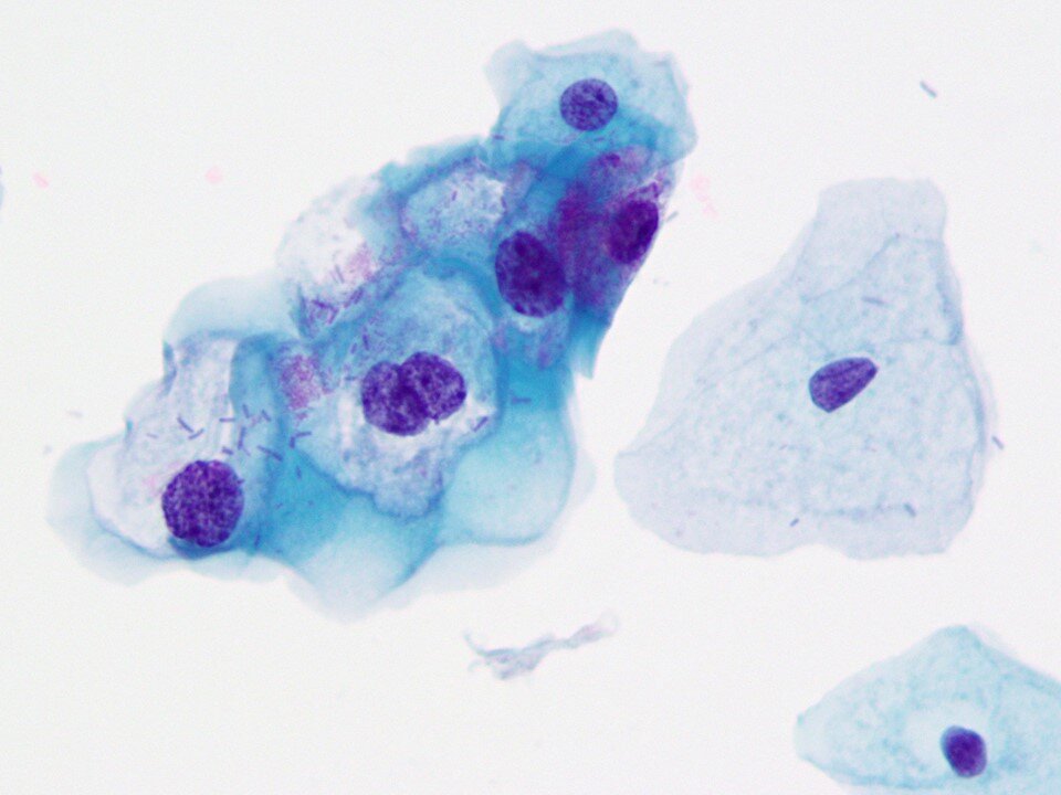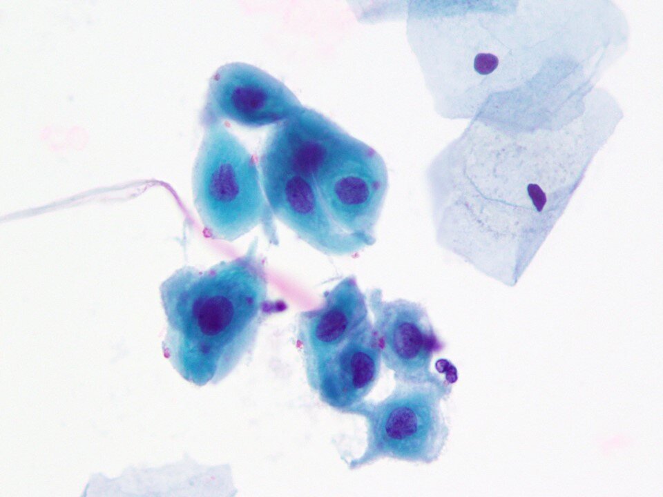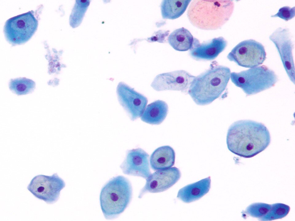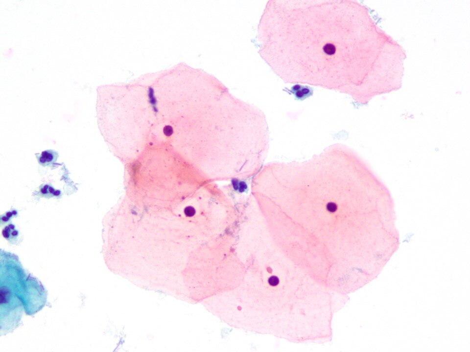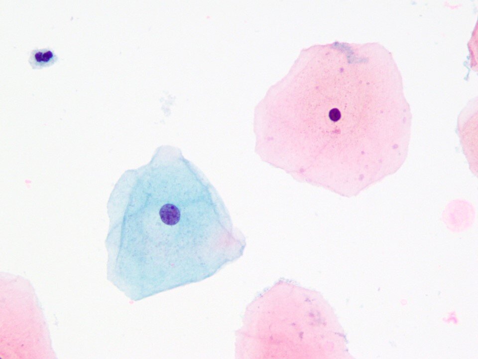 Intermediate squamous cell - Large polygonal cell with transparent pink or blue/green cytoplasm with larger nucleus 8 microns in diameter that is not pyknotic. Occasionally binucleated or even multinucleated. A predominant cell in samples from women of reproductive age.