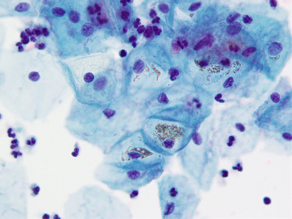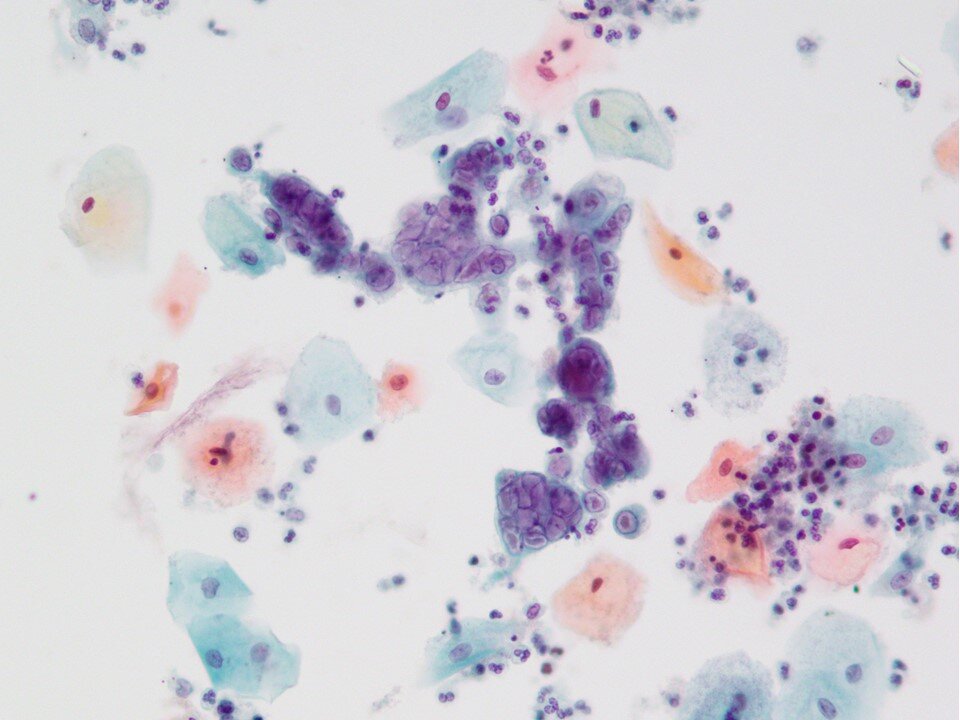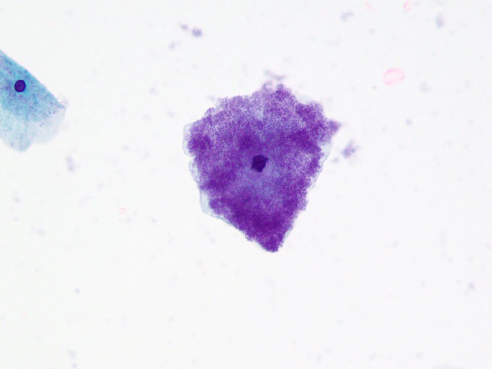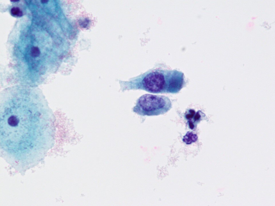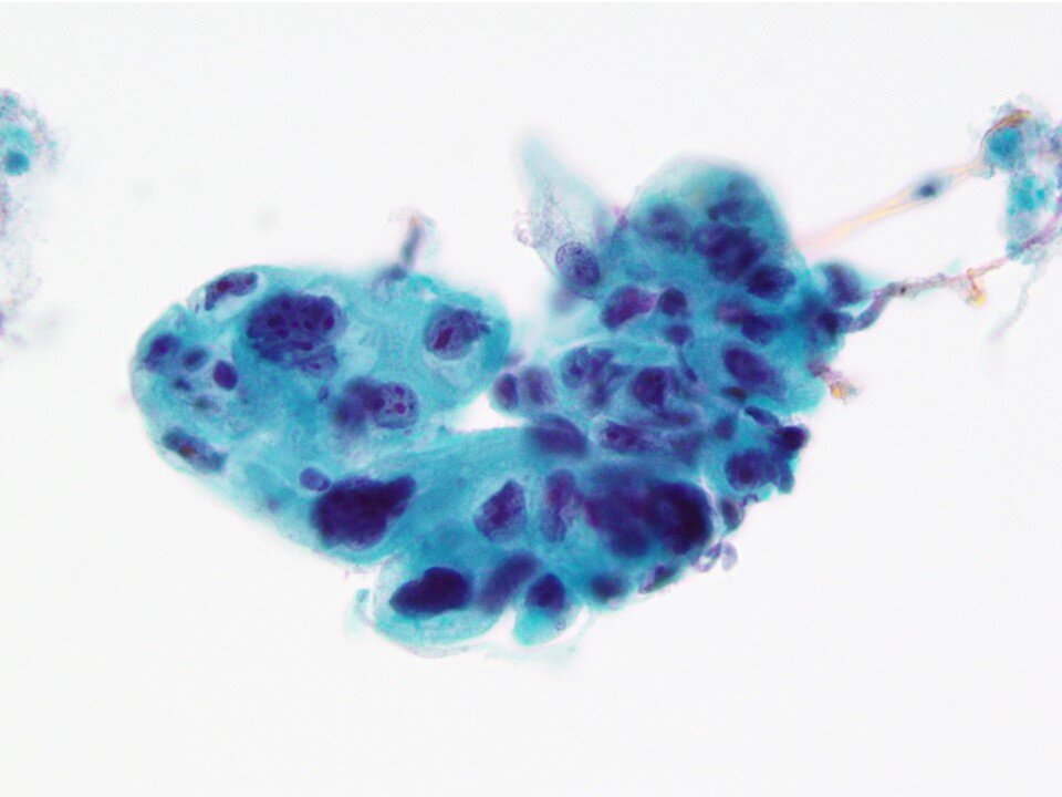 Atrophy - Hallmark cells are basal and parabasal cells. Can be found as isolated cells or in hyperchromatic groups (as seen above). Some features (such as high N:C) may overlap with atypical processes such as HSIL. However, some features that help point to a benign process include finely granular and evenly distributed chromatin texture, smooth nuclear contours, and the absence of significant mitotic activity.