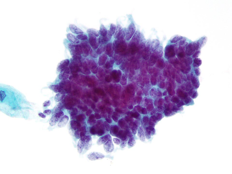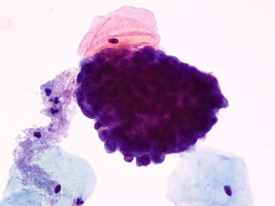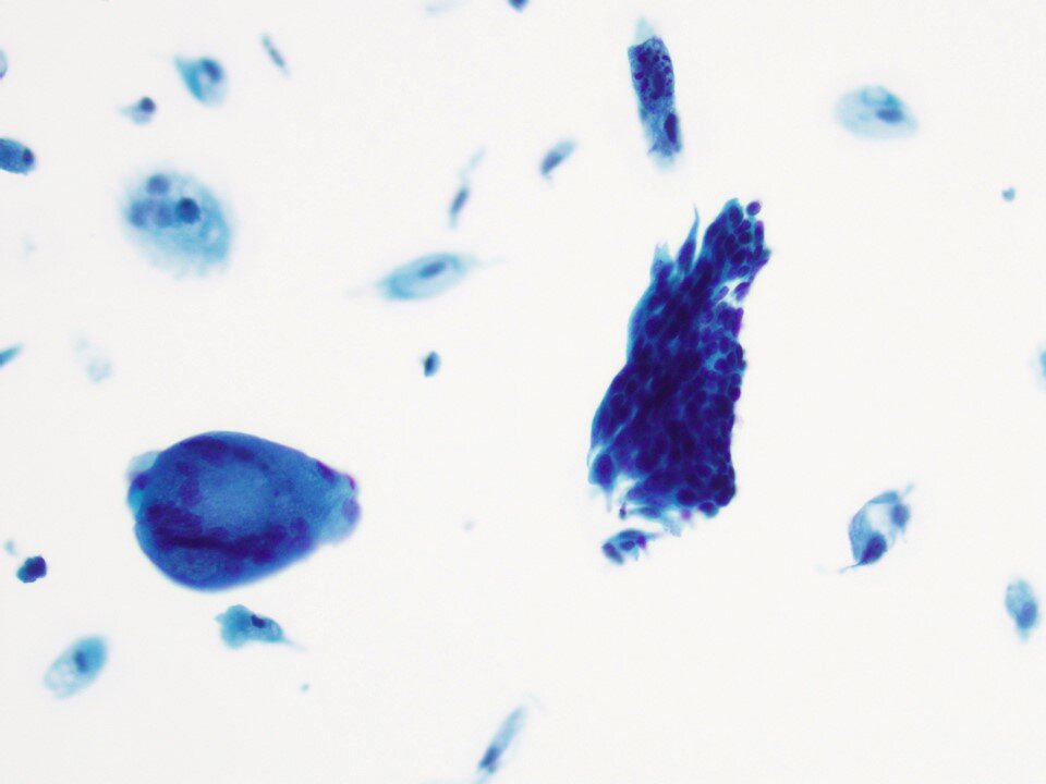 Basal cells - Immature squamous cells - a sign of atrophy (seen here in a hyperchromatic group). Encountered in low estrogen states such as premenarche, pospartum, postmenopause (as in this case), Turner Syndrome, status post bilateral oophorectomy, and administration of exogenous (androgeneric) hormones. The cellular components of atrophy, in addition to parabasal and basal cells, includes histiocytes / multinucleated giant cells and granular debris (not to be confused with the necrotic debris more typical of malignant processes).