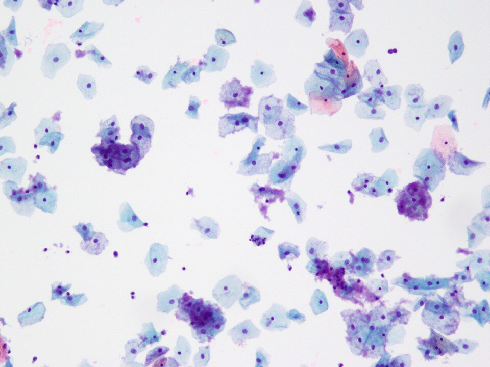 Squamous metaplastic cells - Common morphologic alteration of the endocervical epithelium, usually limited to the transformation zone. Squamous metaplastic cells have a characteristic aqua cytoplasm. They may show mild variation in nuclear size, slightly irregular nuclear contours, and slight hyperchromasia. They can be found singly or arranged as flat sheets in an interlocking fashion like paving stones.