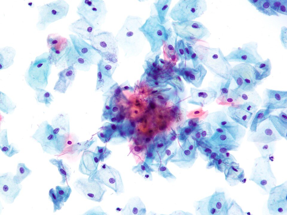 Endometrial cells - tight clusters are the typical appearance. Endometrial cells may be present in pap smears due to a variety of processes, including menstrual shedding in young women. They should be noted when identified in pap smears from women above the age of 45. In this age population, they may still be associated with benign processes and other processes such as polyps, but they have a higher likelihood of being associated with neoplastic / malignant processes (at least compared to younger women). The age cutoff of 45 was chosen as one that is most specific and sensitive based on available studies.
