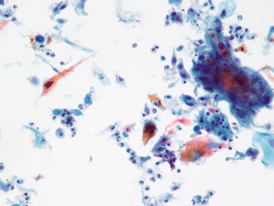 Squamous metaplastic cells - Cells having spindled cytoplasmic projections (“spider cells”) can be seen.